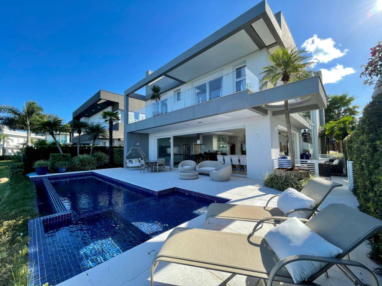 Sobrado com 385m² de área construída em lote com 488m2, totalmente mobiliado e decorado, linda vista de lago, piscina de concreto, split em todos ambientes, persianas e cortinas automatizadas, divididos em 4 amplas suítes, sendo 1 térrea e 1 master com hidro e closet, estar íntimo com banheiro (pode ser feito uma quinta suíte), amplo living 3 ambientes com lareira e lavabo, pé direito duplo, cozinha estilo americana com churrasqueira, lavanderia, dependência de empregada completa, abrigo para carros. IPTU R$ 5.800, 00 Condomínio R$ 1.200, 00
